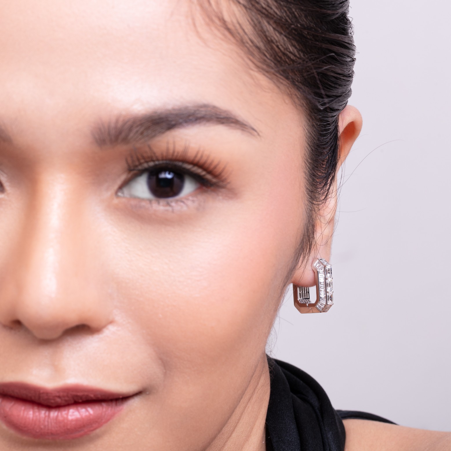 MADE-TO-ORDERA refined rectangular silhouette with softened corners, designed to sit on the ears like frosted glass. Crafted with DEF natural diamonds and custom-cut baguettes, the surface catches light in clean, crystalline flashes creating a cool, structured shimmer. Elegant yet architectural, the Frosted Quadrant Earrings bring a sculpted ease to everyday luxury.