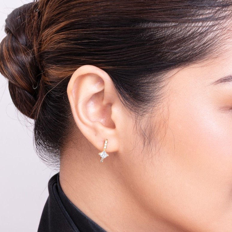 READY-TO-WEARA classic hoop, reimagined with a single princess-cut diamond set at its heart positioned on its point to shine like a star. Crafted in 18K gold, the diamond appears to float in perfect symmetry, catching light with every turn. A delicate expression of brilliance and balance.