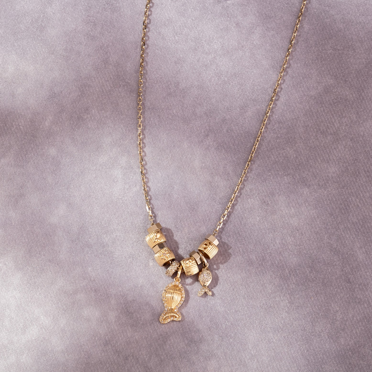 Handcrafted in solid 18K gold, this necklace features nine detailed barrel motifs, each with its own texture and form — creating rhythm and contrast along the chain.
