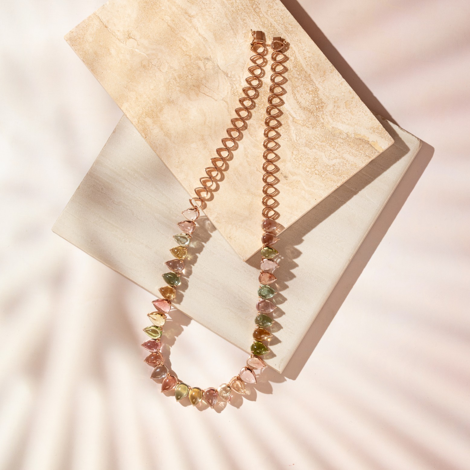 A refreshing play of color and light, this necklace features pear-shaped tourmalines in gradating sizes, each with a lively bubblegum hue that feels youthful and uplifting.